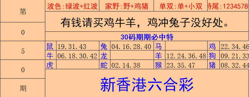 | 六肖 | 鸡牛猪兔蛇羊 | 开:羊47准 |